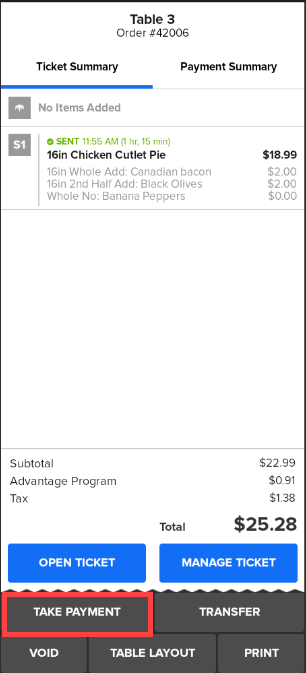 - Tap Take Payment which opens the Payment screen.
