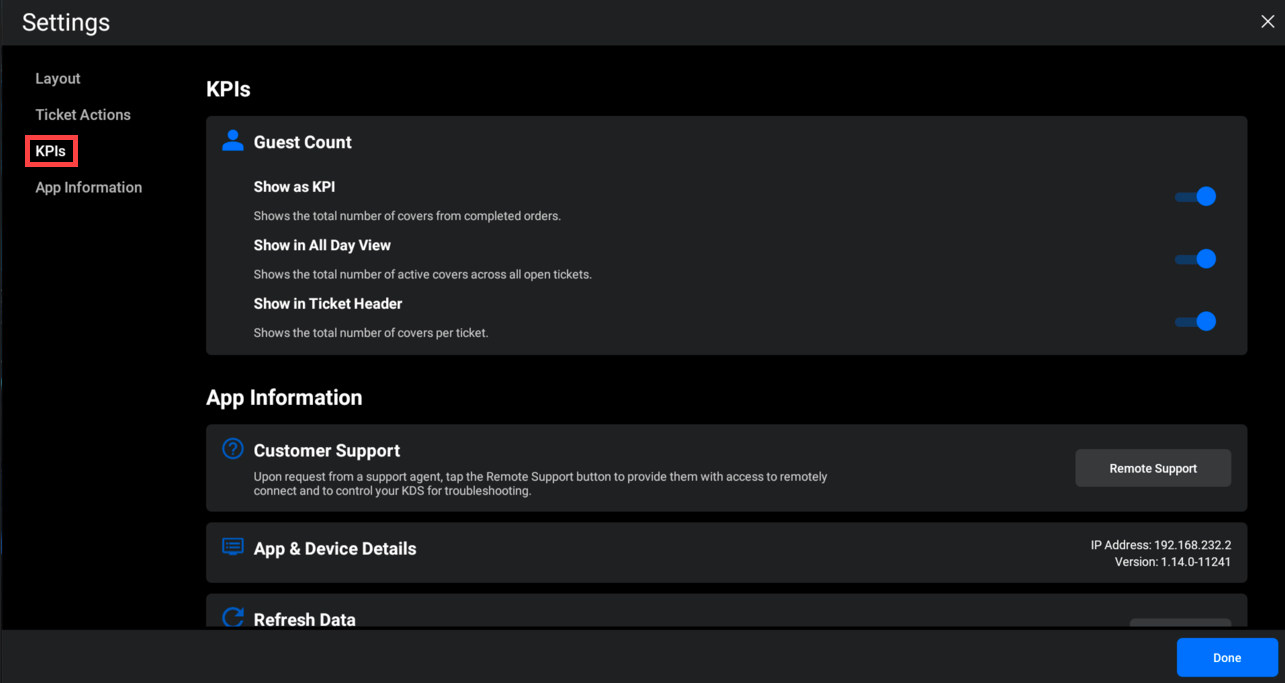 - Tap the gear icon in the lower left of the screen on the KDS to open the Settings screen.
