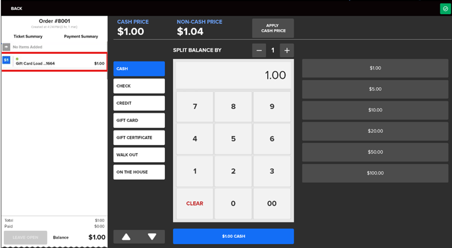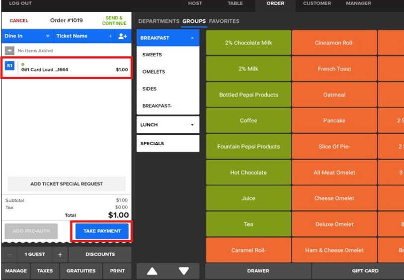 - When you tap Load, a new ticket is created with the Gift card listed as an item. Tap on Take Payment.