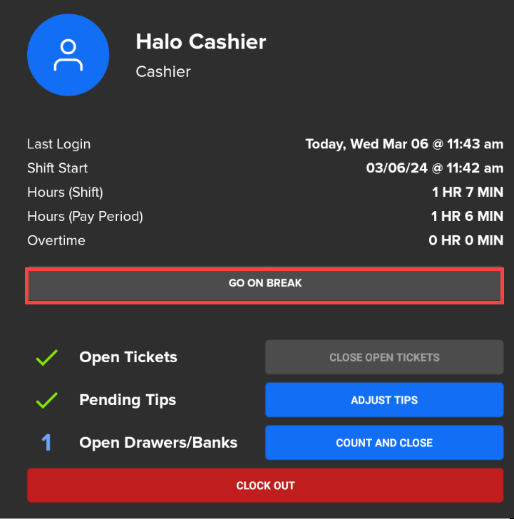 Description: Using SkyTab POS, learn the steps to go on break and return from break.