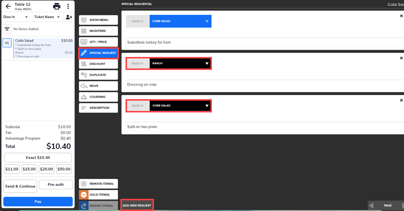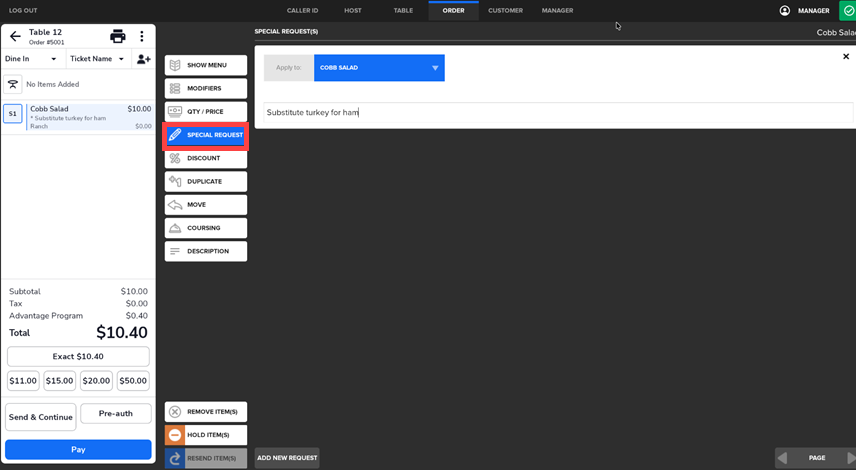 - Tap on the Special Request button, then enter the request using the onscreen keyboard.