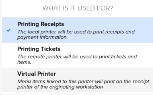 - Select what the device will be used for using the dropdown arrow. Select Printing Receipts and tap Ok.