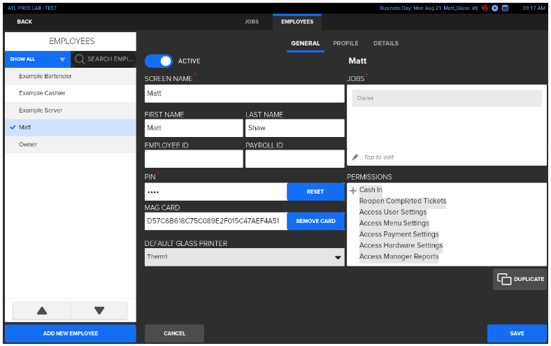 - Both options can be combined to allow the SkyTab Glass to still print if no Default Printer is set at the employee level