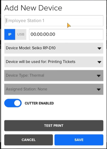 - Tap the Test Print button on the bottom right of the screen to ensure the system recognizes the IP address and properly configures the printer with the SkyTab POS system.