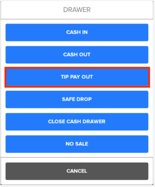 Note: This procedure is only intended for use in locations where non-cash tips need to be manually paid from cash drawers. Do NOT use this process if you are not certain whether SkyTab POS has been configured to use manual tip payouts.