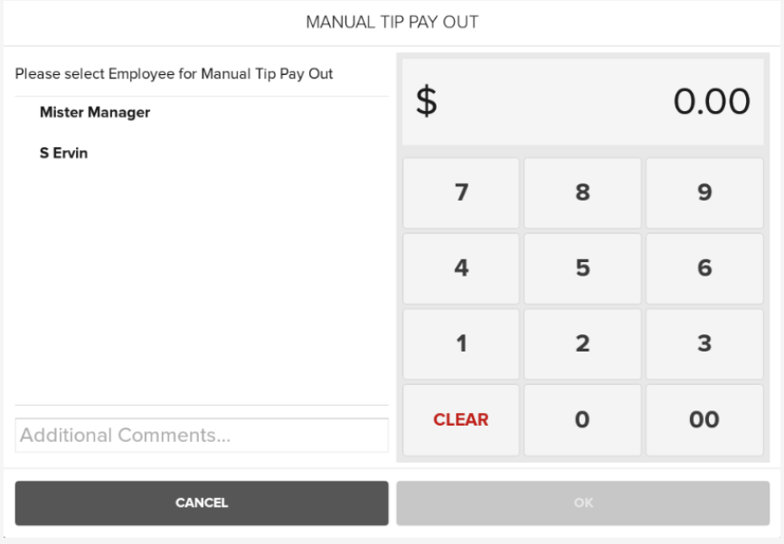 Before paying out tips, ensure the employee no longer has any open tickets or pending tip adjusts. Use the POS station attached to the cash drawer from which you will be paying non-cash tips.