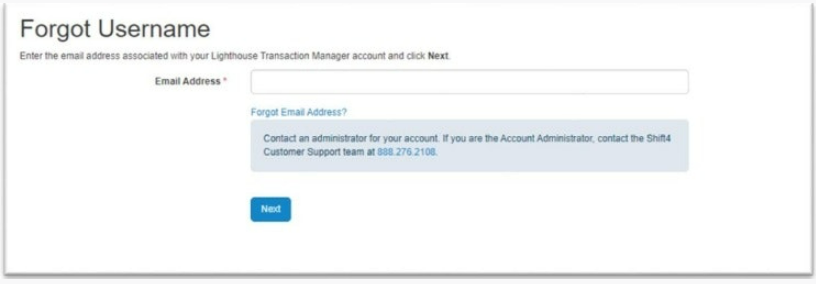 - Enter your Username. If the username is not known, an email address is needed. This needs to be associated with the LTM account.