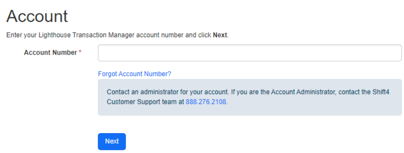 Note: If any of the following information is not known and the user is not the administrator, the administrator for the account must be contacted. - Enter your LTM Account Number, and click Next.