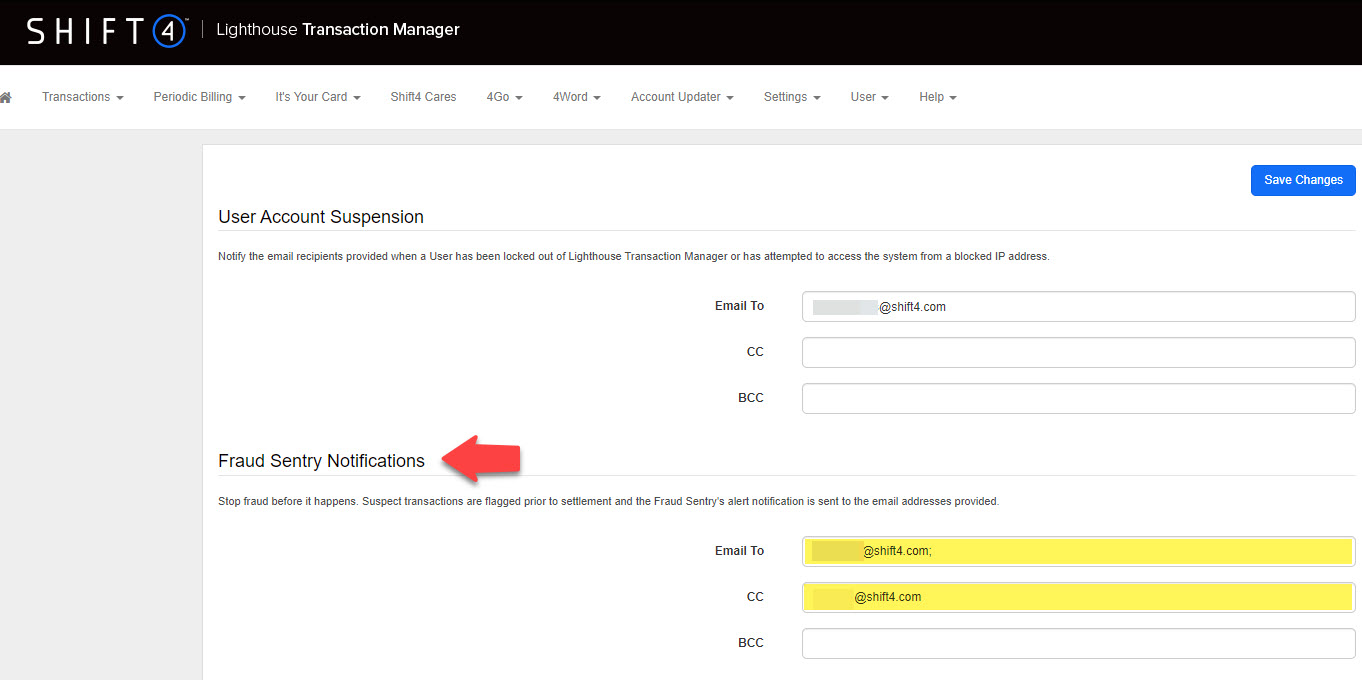 - Set up the users to receive notifications when issues are detected. This is located under the "Fraud Sentry Notifications" section. Here you can assign a recipient email and the CC or BCC contact(s).