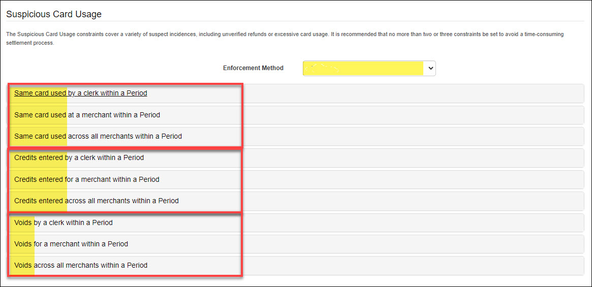 - Under "Suspicious Card Usage," only set one or two scanning options listed since if too many scans are performed, your batch can timeout and fail to upload to the processor when finished.