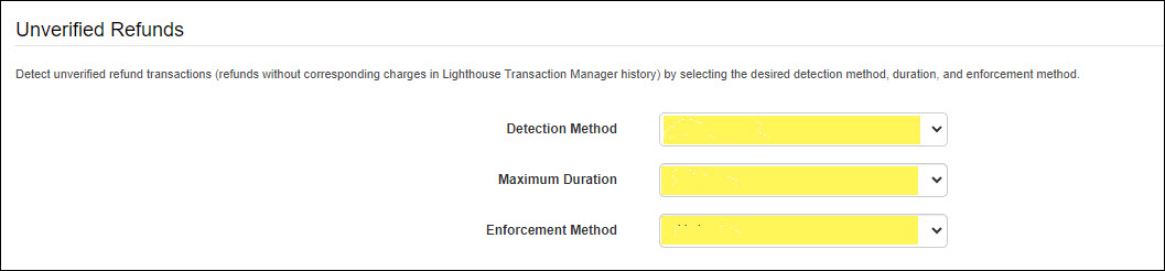 - Set the desired "Unverified Refunds" settings for Detection Method, Maximum Duration, and Enforcement Method.