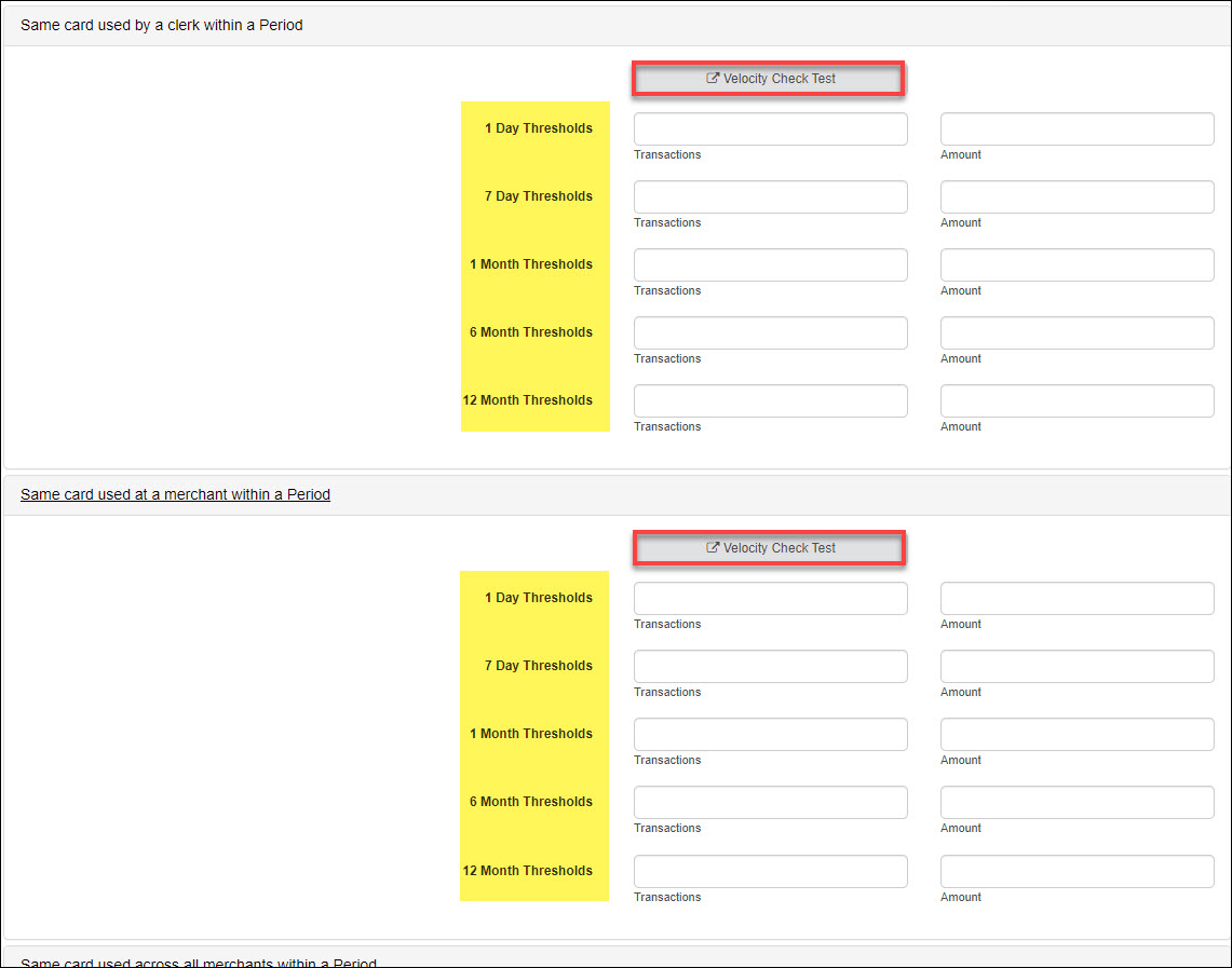 - Same Card Used: This is categorized by clerks, specific merchant account, or all merchant accounts within a time period (only set one of the three options listed; do not run more than one of the same scans).