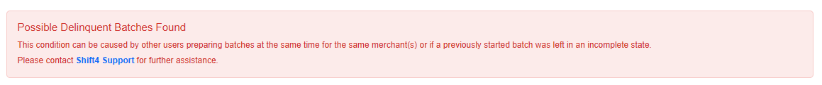 When a delinquent batch is present, you will see a warning in Current Transactions and Archives that states you have a possible delinquent batch. Contact Support for assistance.
