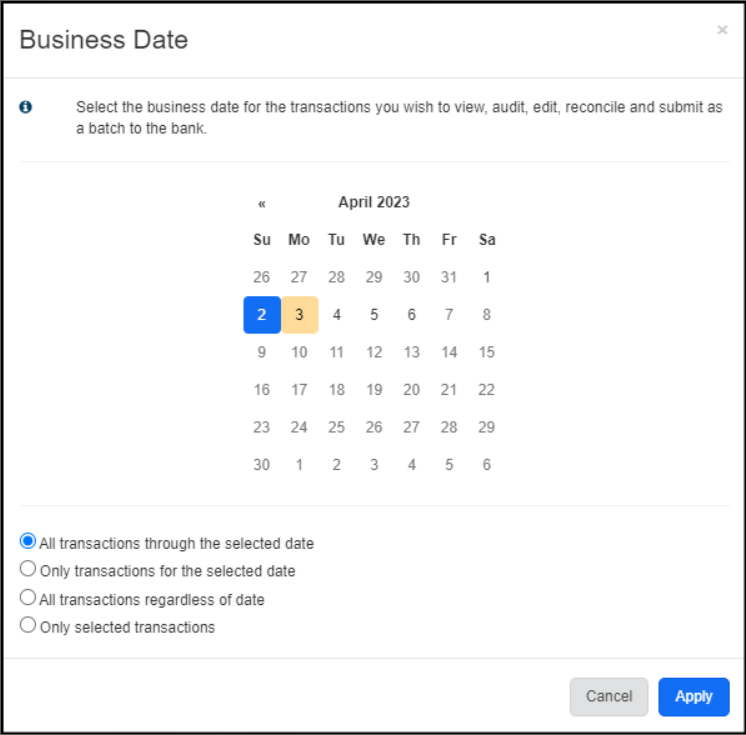 Note: The calendar automatically defaults to the previous business date. Select a new business date as needed.