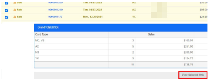 Note: If you have selected specific transactions to include in a batch, an additional button may appear, “View Selected Only. " This button would then show only the selected transactions that will be included when you select Close Batch.