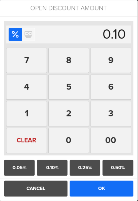 An Open Discount allows you to either enter a custom discount amount at the time of sale or select a preset value.