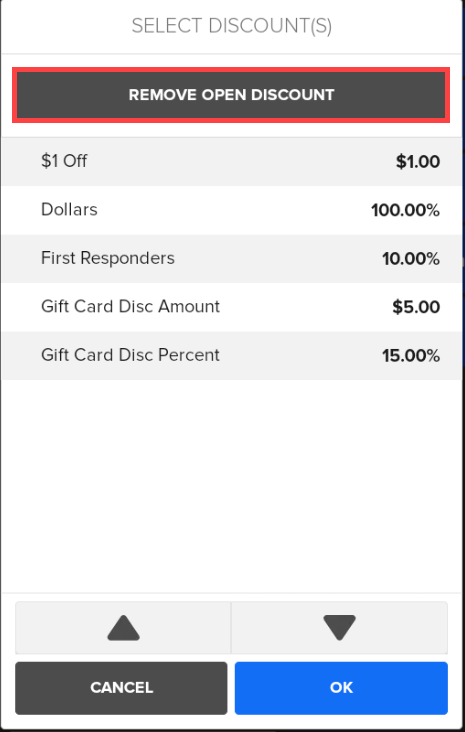- Tap OK to apply the Open Discount to the item.