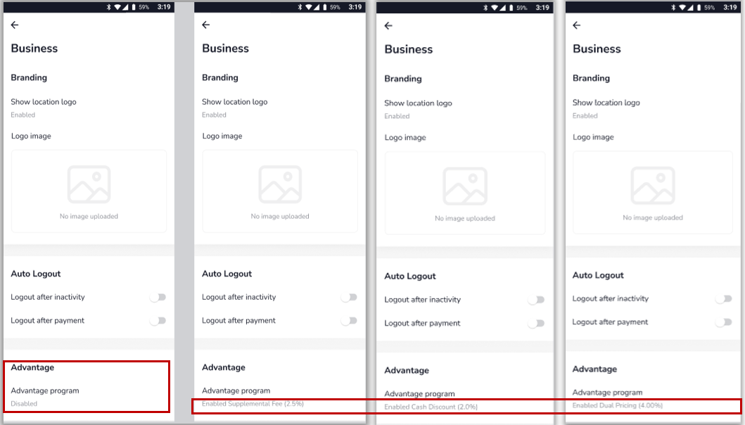 Description: The new Advantage program will offer an option to choose Dual Pricing, a Supplemental Fee, or a Cash Discount program (only one can be selected at a time). The Supplemental Fee will be automatically applied to all tender types. The Cash Discount is only applied to the cash tender type. Dual Pricing offers the ability to set a % that will reflect two different prices, cash and non-cash.