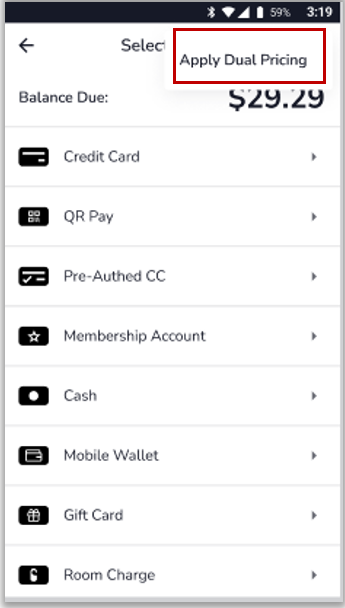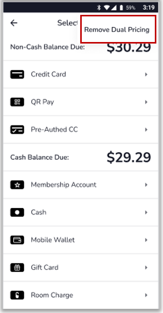 - Select Remove Dual Pricing to be able to pay cash price with non-cash tender.