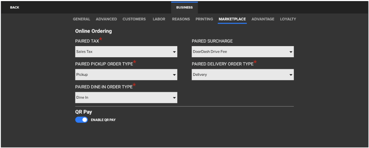 Use the Order Type fields (Paired Pickup, Paired Dine-In, and Paired Delivery) to pair those order types on the POS when an online customer selects one of those options.