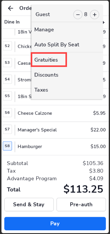 - Once the gratuity has been added, tap Pay to settle the ticket.
