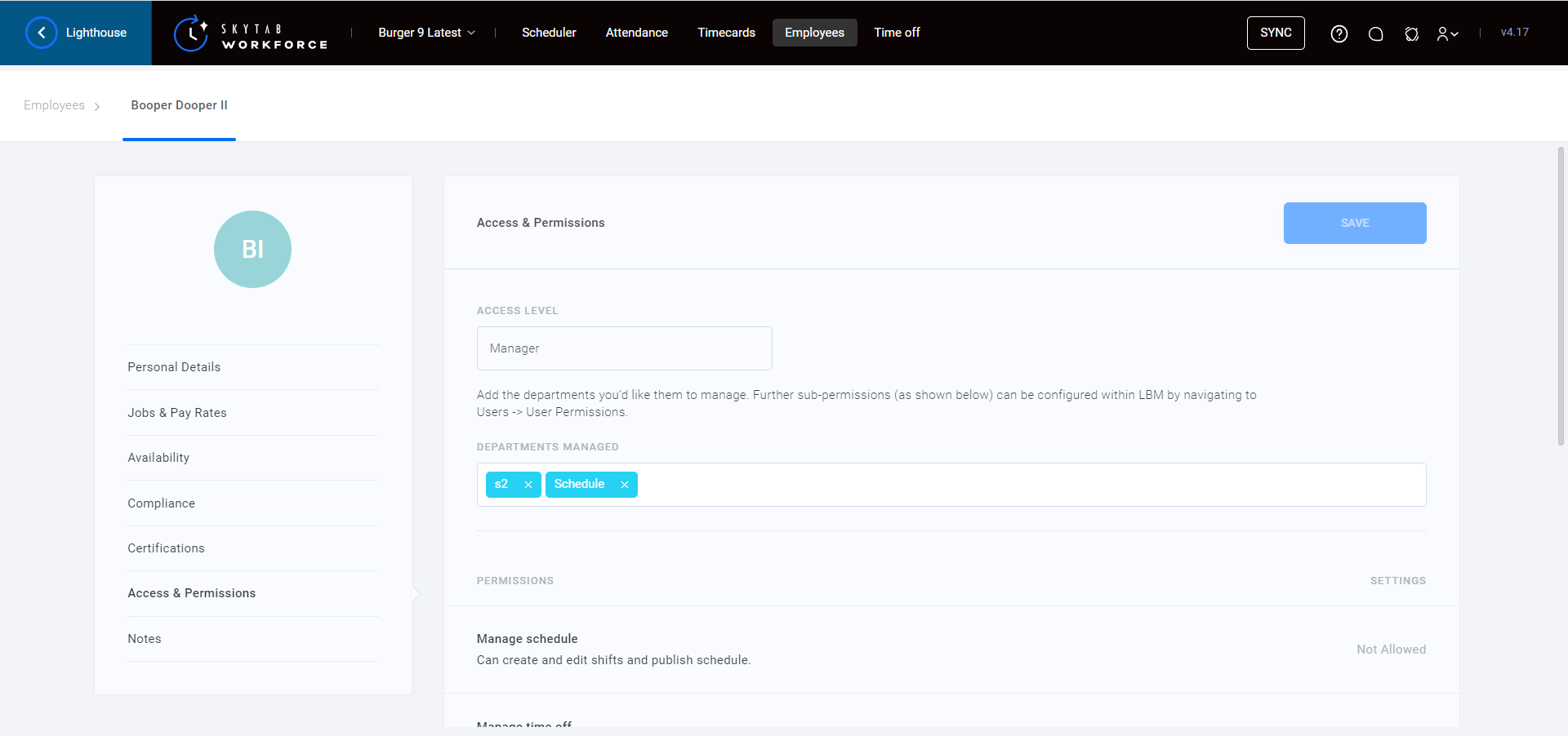 Only those users who are specifically given access to manage a department can do so. ‘Managing a department’ (and the Manage Schedule permission) provides the ability to view, create, and edit shifts and schedules. To grant a manager access to a department: