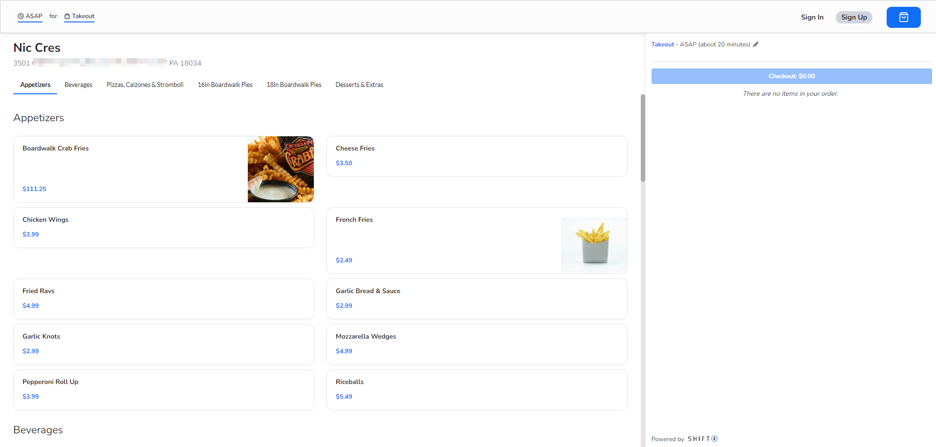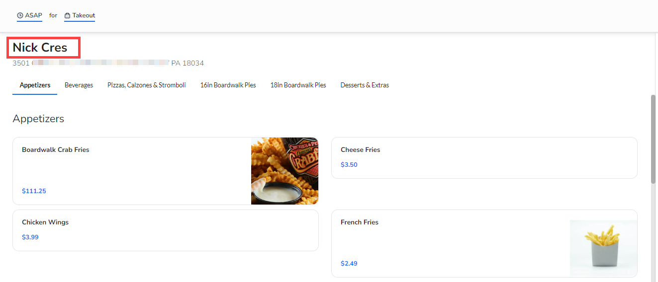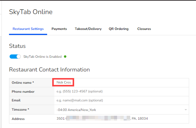 Your site will open in a new window. - If you need to make a change, go back to your SkyTab Online settings in Lighthouse. In this example, we needed to make a correction to the Online name for the Restaurant Contact Info: