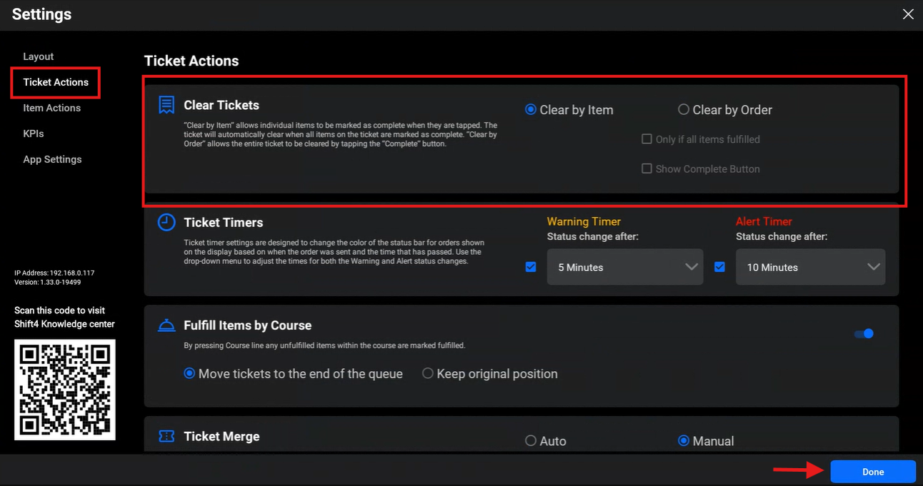 - Select Ticket Actions on the left of the settings screen. In the Clear Tickets section, select Clear by Item or Clear by Order.