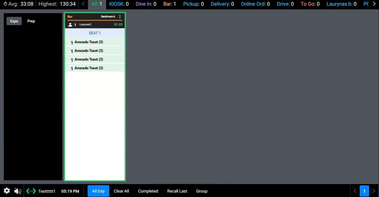 Note: Items with a green background indicate they are selected/fulfilled. - The "Clear by Order" option allows clearing out the ticket by selecting the Complete button at the bottom of the ticket or by selecting the Bump Ticket on the KDS Bump Bar.