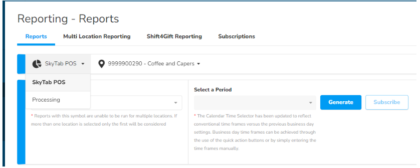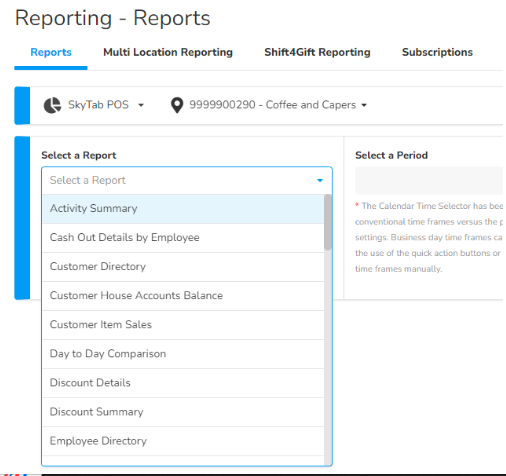 Use "Select a Period" to select the range for the report you wish to view. You can use the calendar to set a custom date range or choose from one of the options presented.
