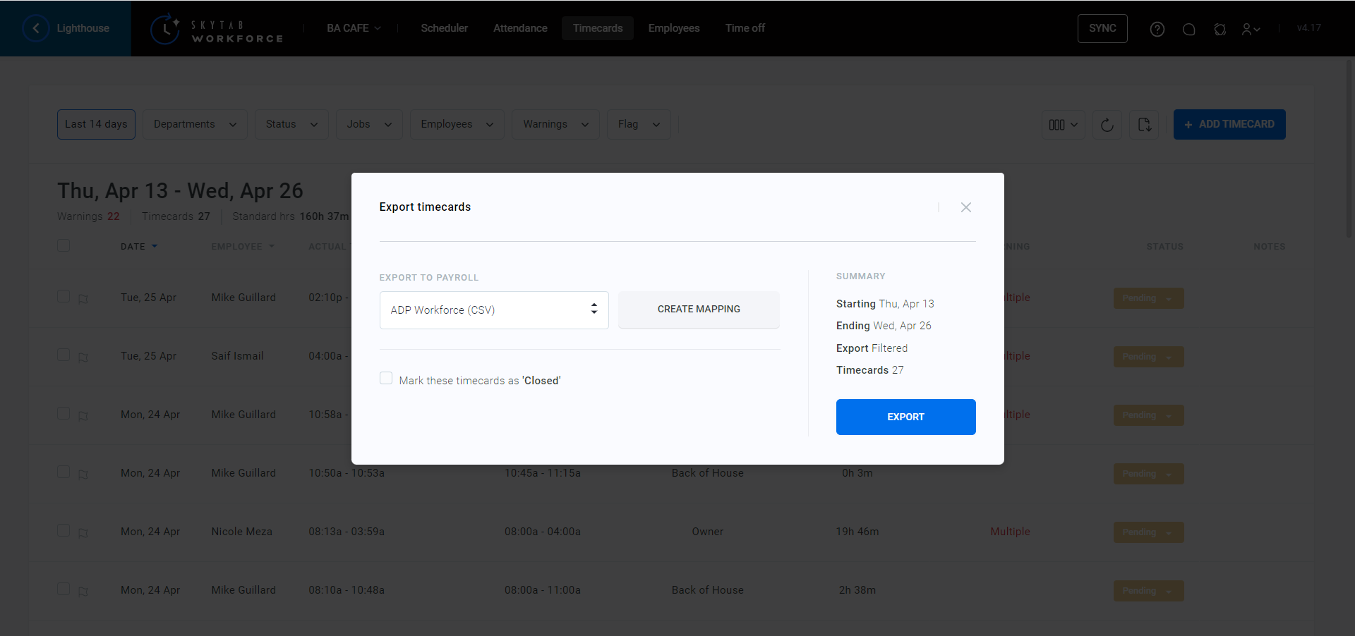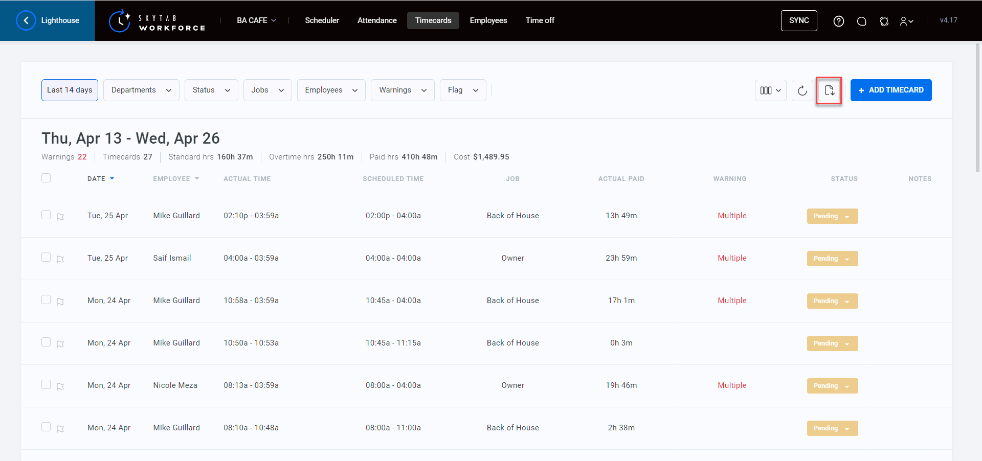 - Select the Export button next to Add Timecard.