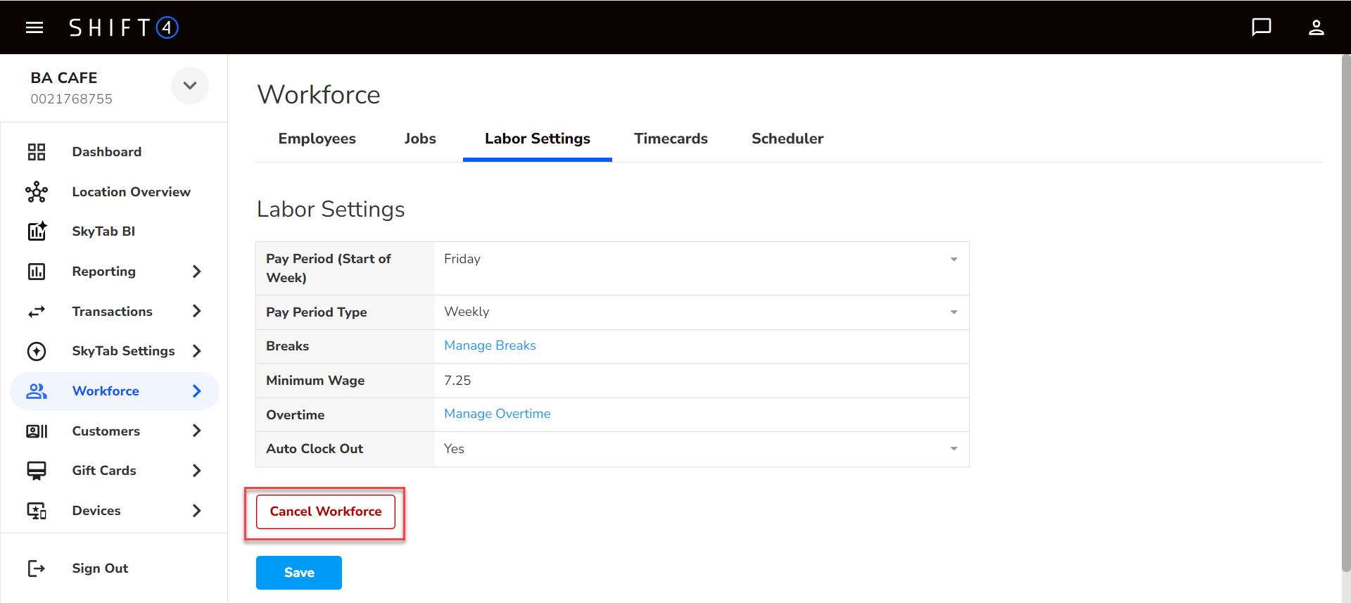 - Select the Cancel Workforce button near the bottom of the Labor Settings to cancel the SkyTab Workforce subscription.