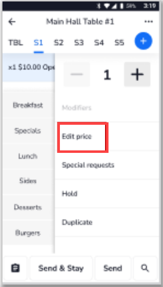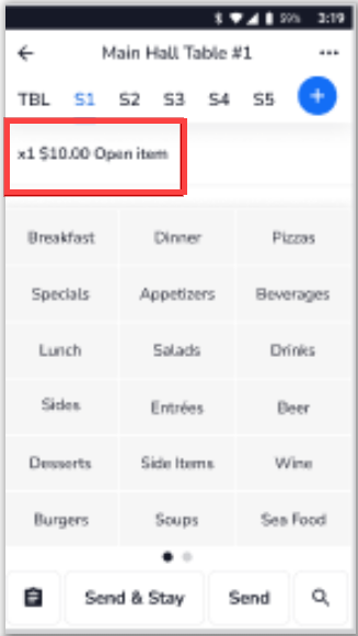 The “Open item” in the check’s items list is displayed. - You can edit the price by tapping on the item and then selecting Edit price.