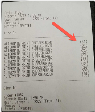 - Tickets printed in the kitchen will display seat numbers instead of guest numbers. This is only a change to the labeling – guest and seat are interchangeable terms – but the receipts will print as shown: