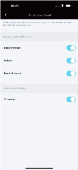 Choose to be notified about worker time off requests, swap, and drop requests. If you manage a schedule for a department that you don't want to receive notifications about, unselect it.