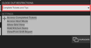 These restrictions are designed to ensure that a user completes specific actions that help ensure the system is properly balanced at the End of Day.- Complete Tickets: (Default Option for all newly created jobs and existing jobs that get this setting). The employee is able to clock out after all open tickets are transferred/closed. The employee does not need to adjust tips or perform a cash count. The clock out button is always enabled and allows a user to clock out as long as they do not have any open tickets.
