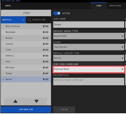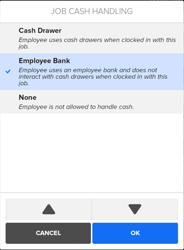 - Employee Bank: The employee uses an employee bank and does not interact with physical cash drawers when clocked in with this job.