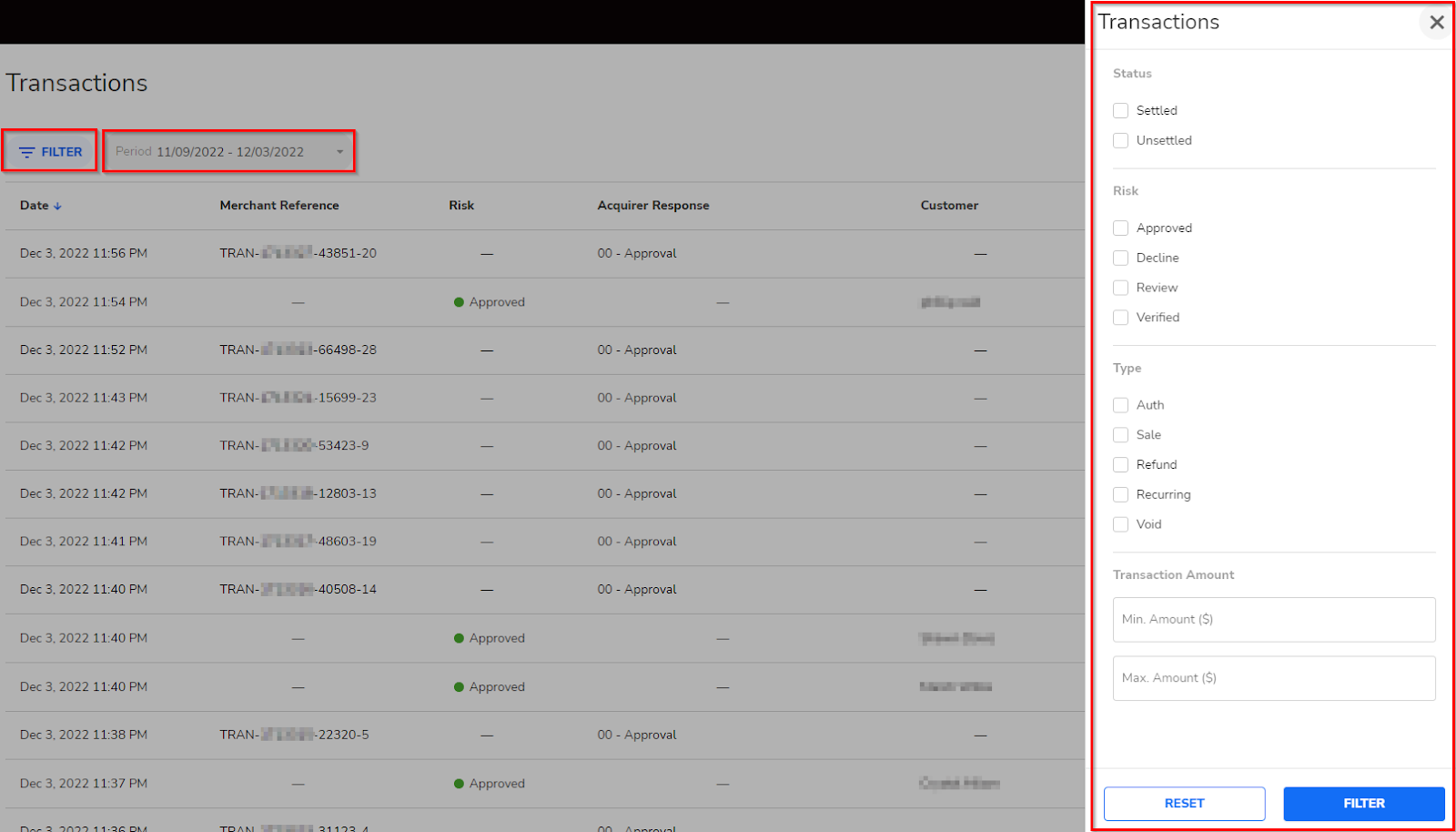 Description: The Transactions landing page displays near-real-time transaction data, including current (unsettled) and historic (settled) transactions.