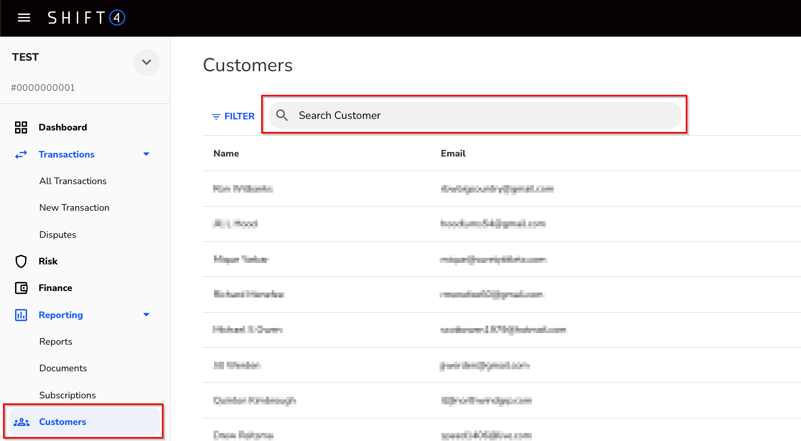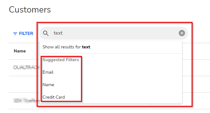 Once some text has been entered into the ‘Search Customer’ box, a user has the option to submit the text they have entered or to use a suggested filter.