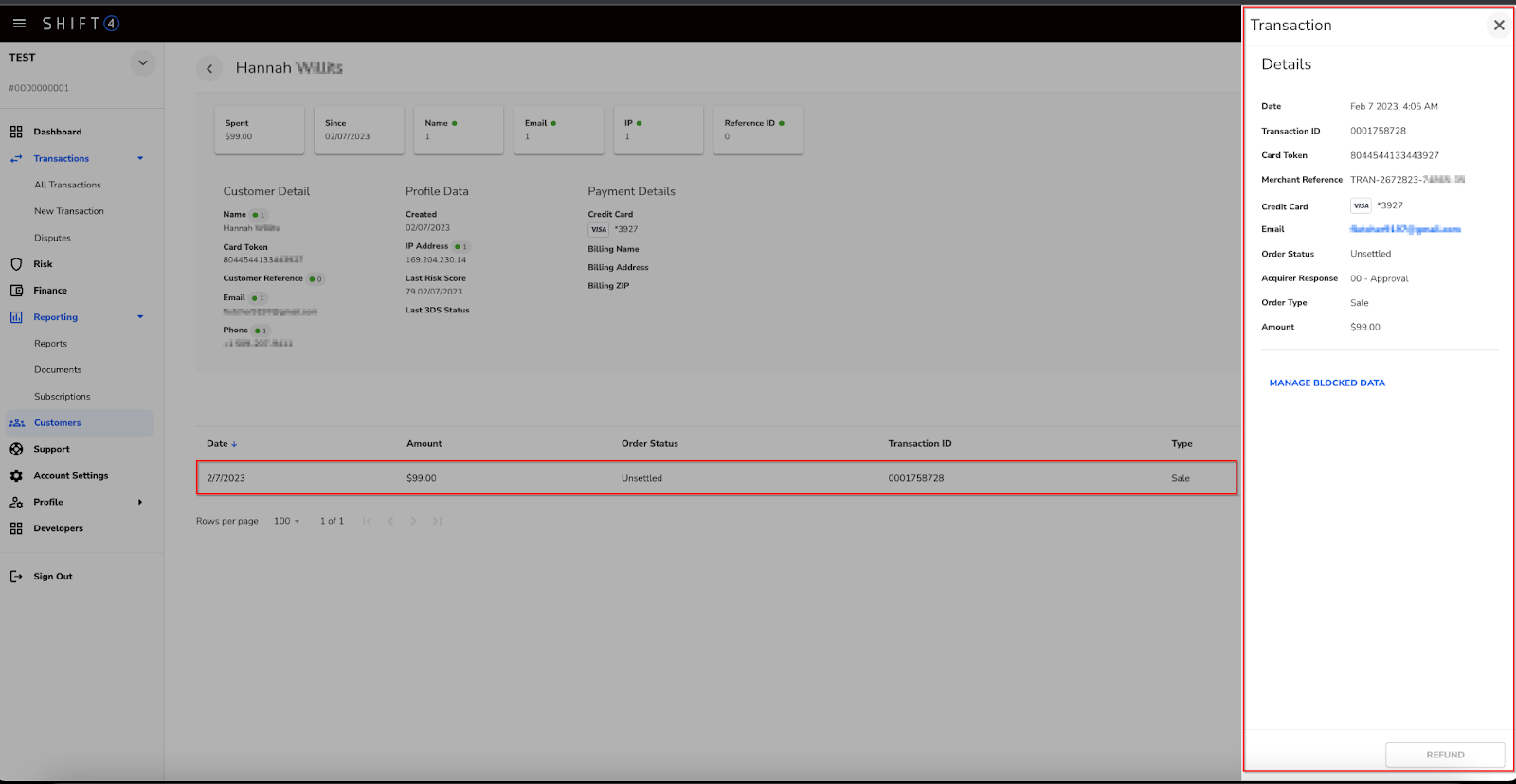Finally, selecting a row in the table allows for a more in-depth look at the linked transactions. This will initiate the Customers Page Transaction Slider to appear on the right side of the screen.