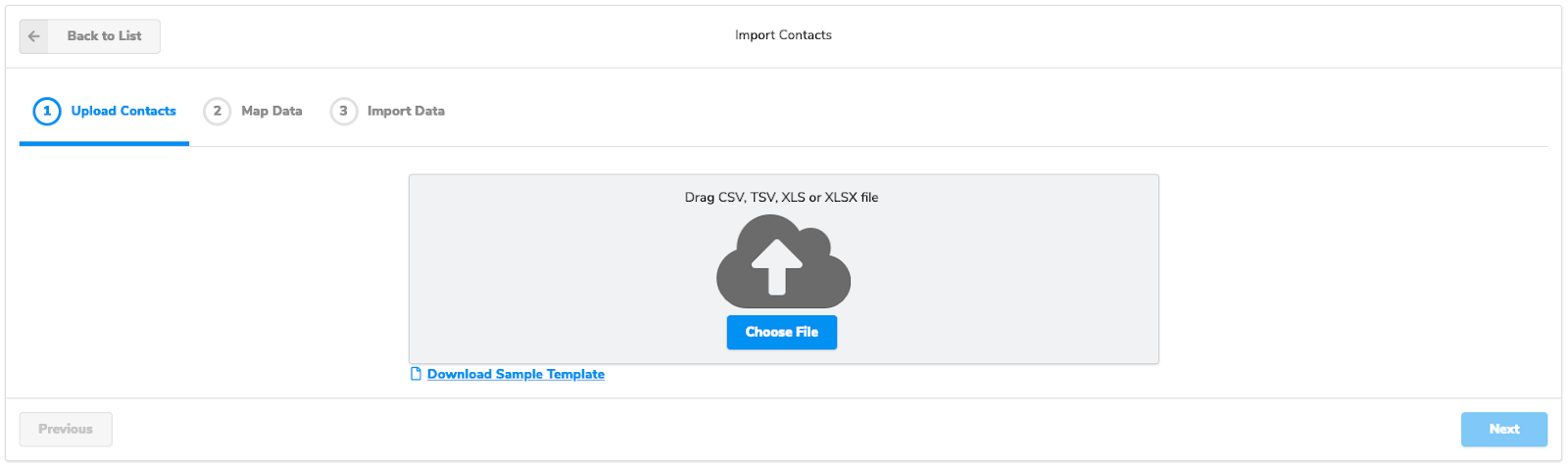 - Drag and drop the file to the screen or select the Choose File button. Once the template is added, confirm the information in the "Map Data" section by selecting Next. Import the data to complete the process.