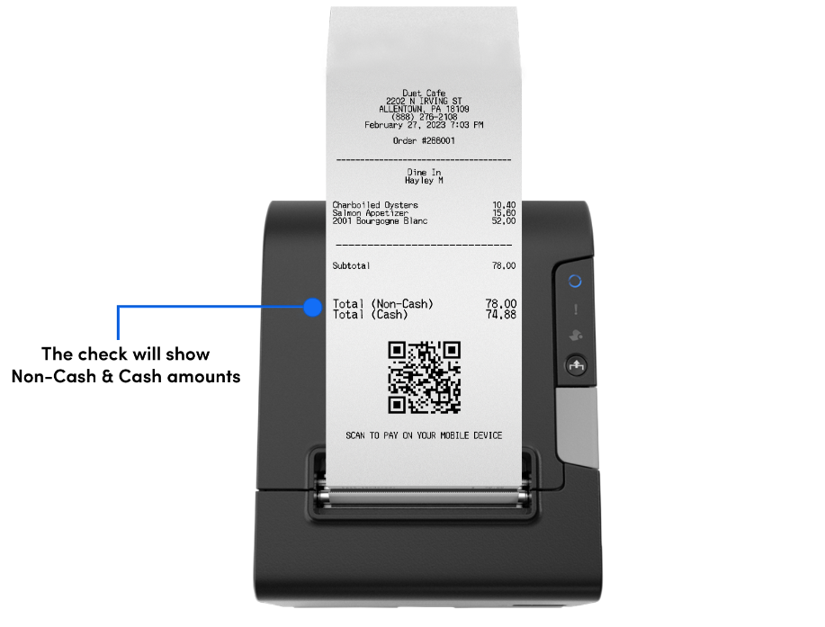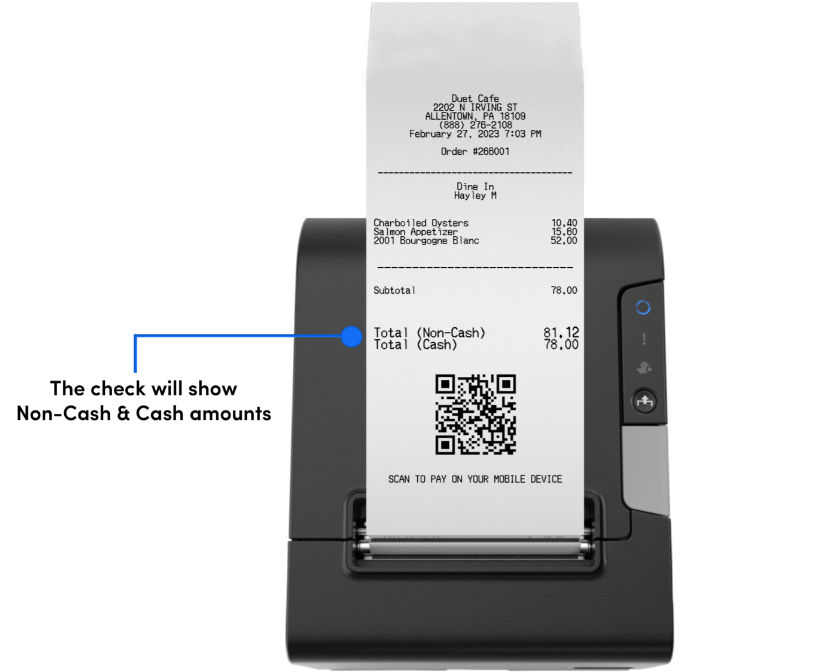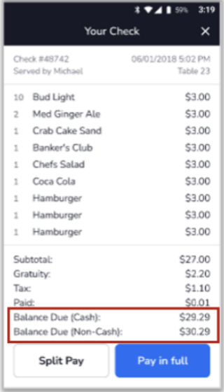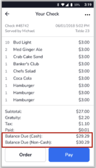 Dual Pricing Option: With Dual Pricing, you can offer a simple cash vs. non-cash total on the receipts presented to customers and on the customer-facing displays. The cash price will automatically be applied on the Payments screen when cash or gift cards are chosen.