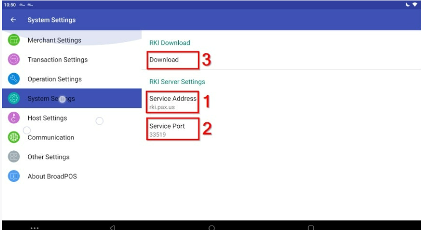 Ensure the Service Address (1) and Service Port (2) are set to “rki.pax.us” and “33519” respectively. Tap Download (3) when ready.
