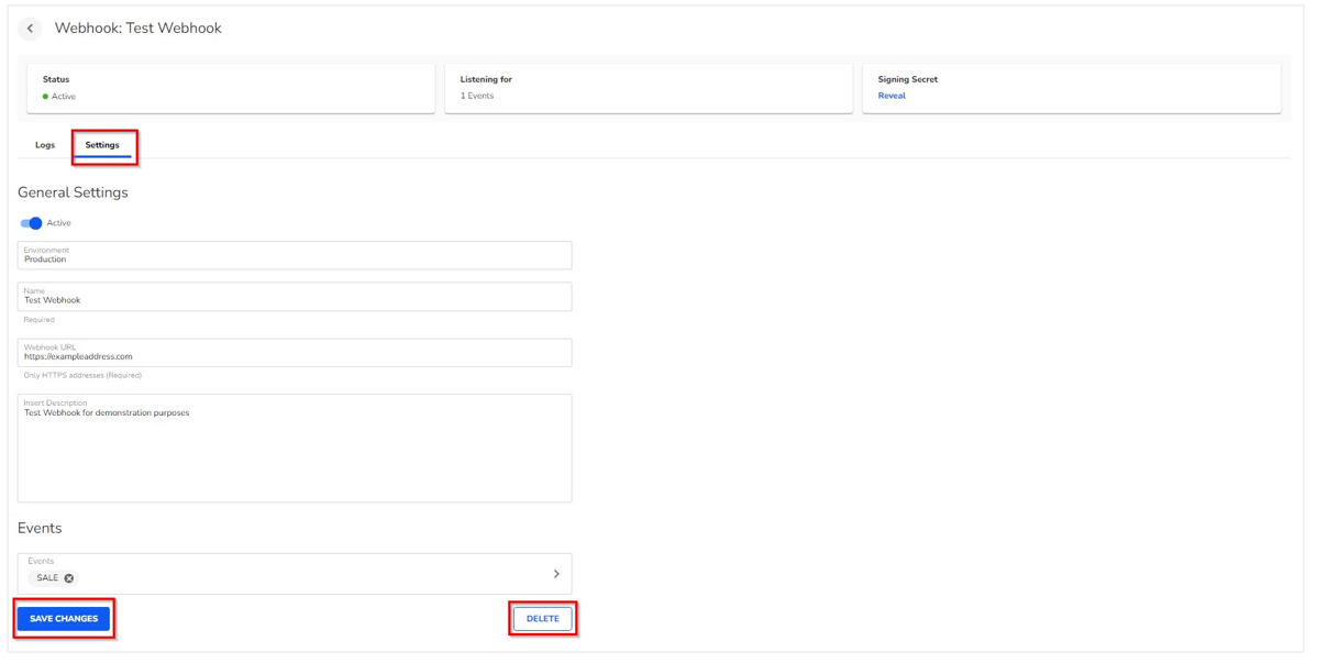 - To delete a webhook, select the Delete button in the bottom right corner of the screen if desired.