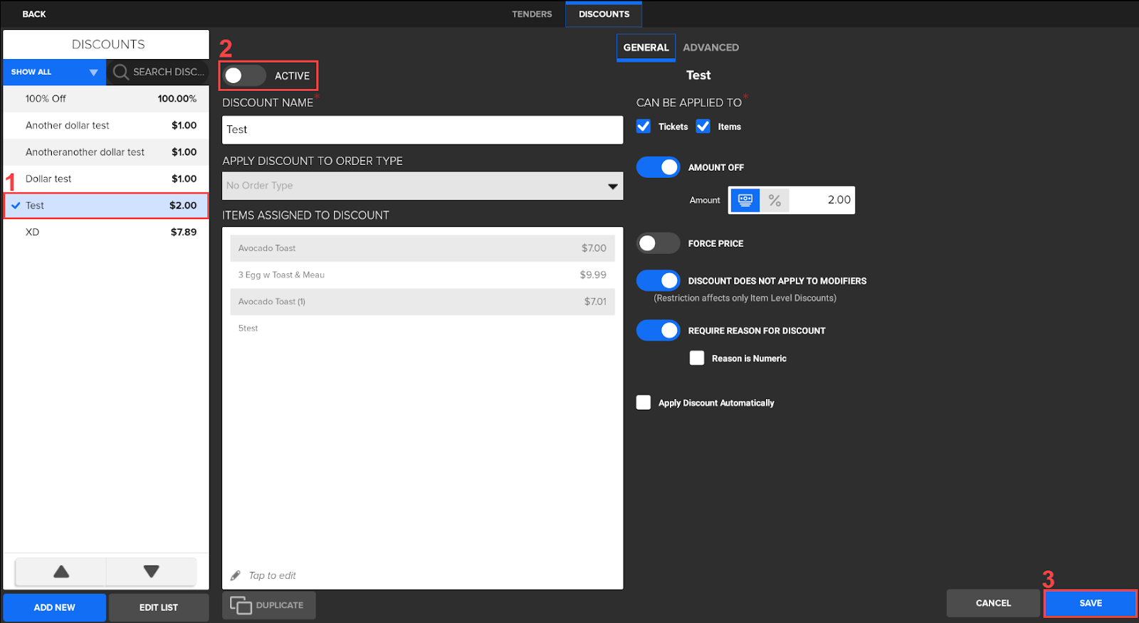 Active: Ensure the selected discount appears when toggled right on the order entry screen.