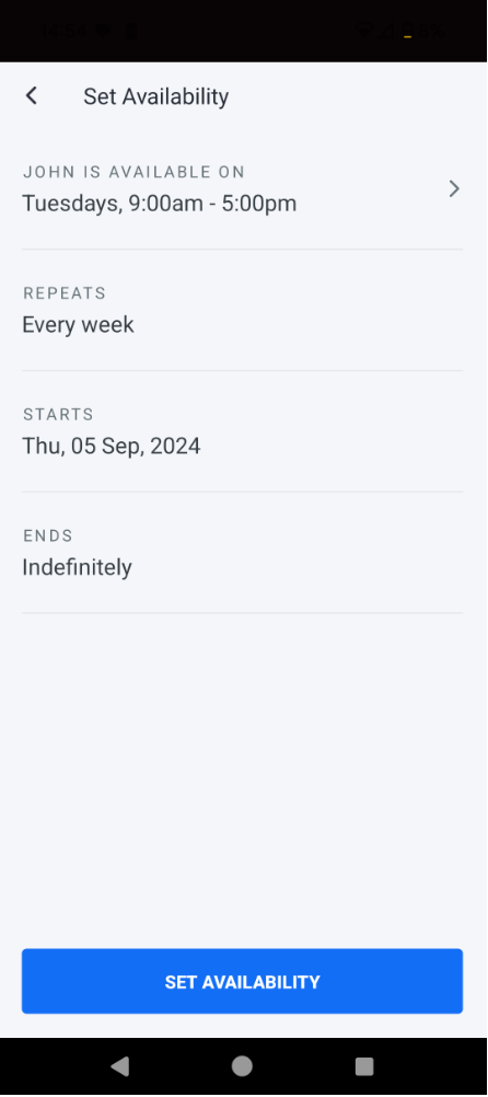 When creating, editing, or approving an availability set for an employee, the app will check that the availability does not conflict with one of the employee's existing availability sets.