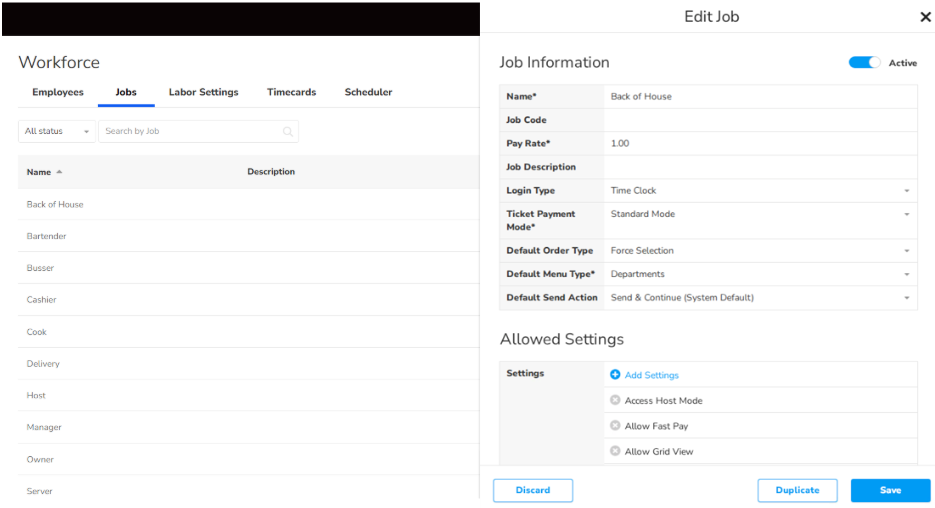 To manage jobs, select the Jobs tab from the Workforce screen. On this screen, you can edit current jobs or add new jobs.