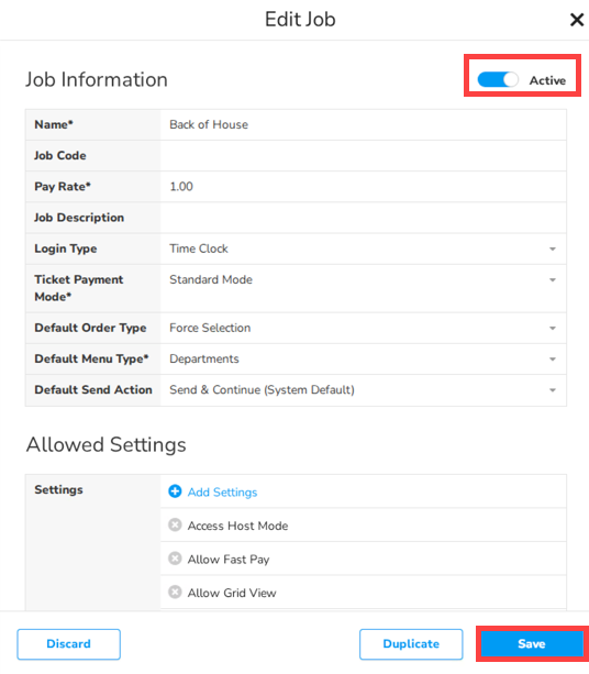 - The Edit Job screen will appear. Here, you can deactivate the job by sliding the Active toggle OFF (gray).