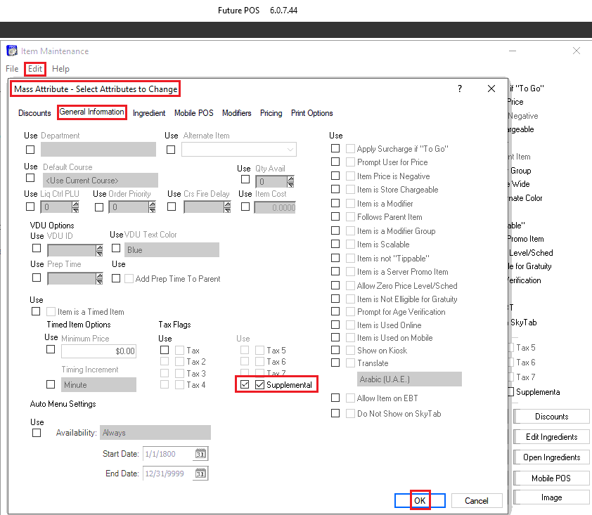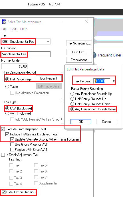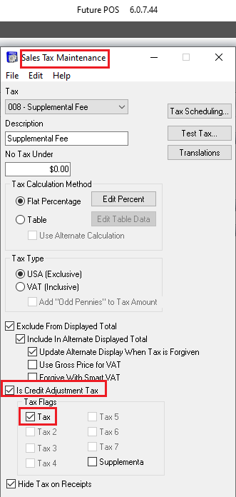 - Under Tax Flags, enable the Supplemental Fee. Ensure both boxes are enabled to apply it to the items.