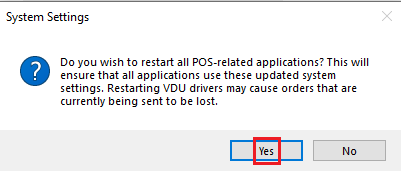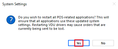 Note: When you save in System Settings, it will restart the front end on every terminal. Ensure they are not open or if they are open, aren’t settling a check or entering an order. - After a few moments, you will see the following pop up window. Select Yes.